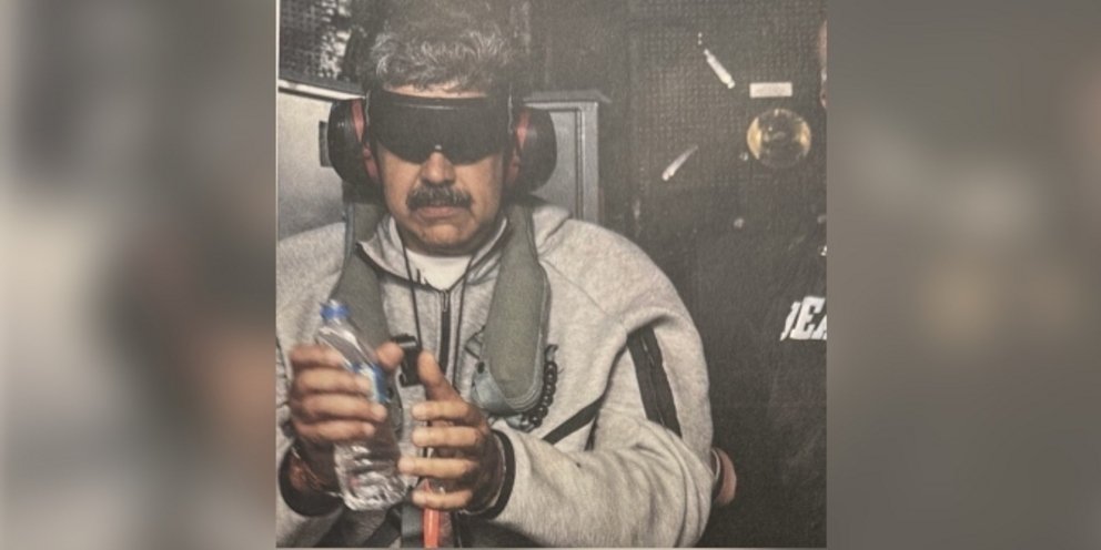 Η εικόνα δείχνει τον Μαδούρο με χειροπέδες, δεμένα μάτια και ακουστικά, φορώντας γκρι φόρμα και κρατώντας ένα μπουκάλι νερό.