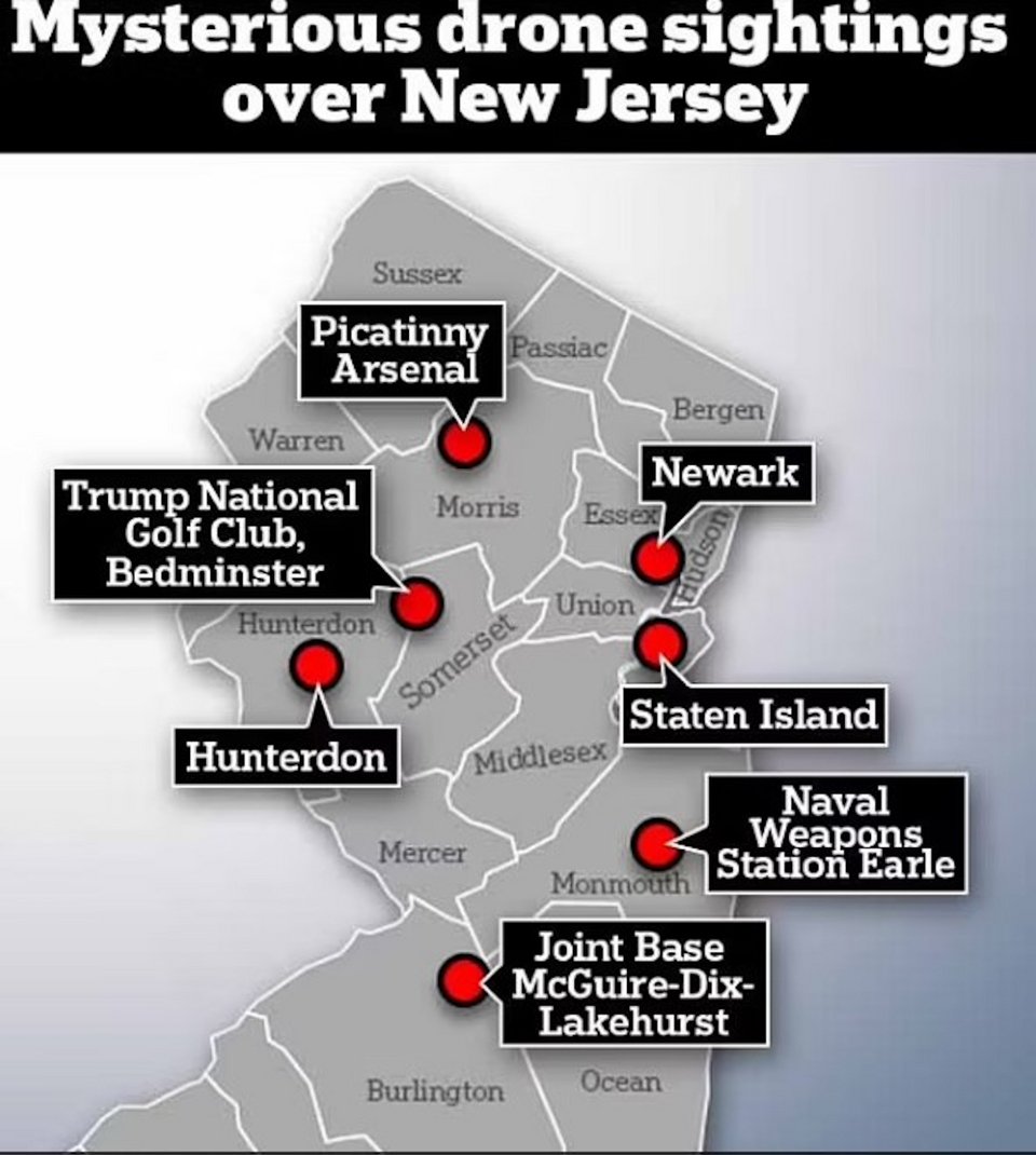 Τουλάχιστον από τις 18 Νοεμβρίου, οι αξιωματούχοι του Νιου Τζέρσεϊ και οι ομοσπονδιακοί ερευνητές έχουν ταλαιπωρηθεί από αναφορές για ανεξήγητα ιπτάμενα αντικείμενα -μερικά από τα οποία ήταν τόσο μεγάλα όσο τα αυτοκίνητα- που πραγματοποιούσαν παράξενες, μη προγραμματισμένες νυχτερινές πτήσεις πάνω από ευαίσθητες τοποθεσίες σε ολόκληρη την πολιτεία.