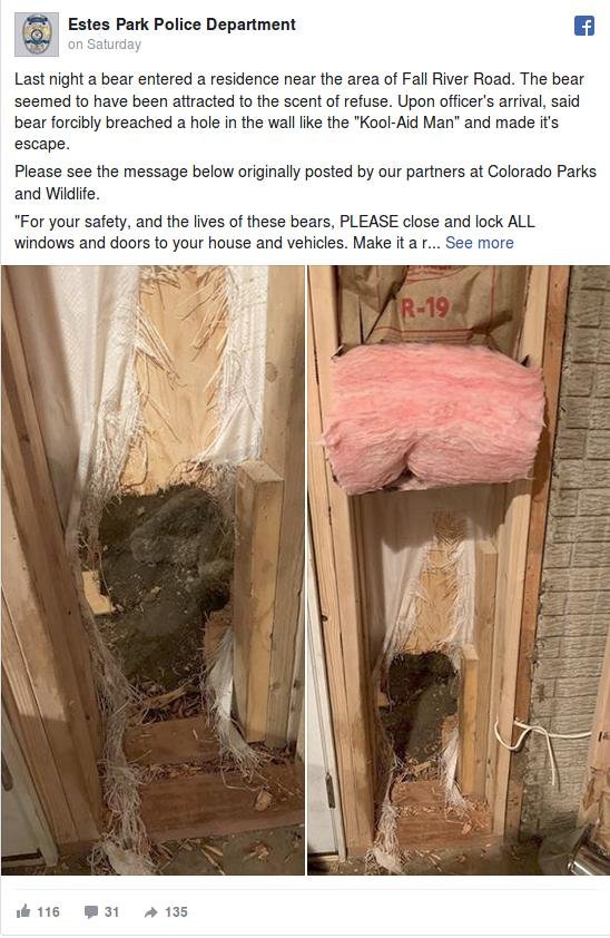 Η αστυνομία του Estes Park στο Κολοράντο ανήρτησε στο λογαριασμό της στο Facebook φωτογραφίες με την τρύπα και τις ζημιές που προκάλεσε κατά την... επίσκεψή της την περασμένη Παρασκευή η μαύρη αρκούδα. Όπως λένε, μάλλον η μυρωδιά των σκουπιδιών προσέλκυσε το παμφάγο κτήνος στο σπίτι.
