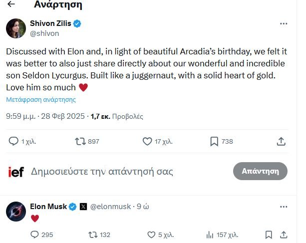 «Συζητήσαμε με τον Ίλον και, με αφορμή τα γενέθλια της όμορφης Αρκέντια, θεωρήσαμε ότι ήταν καλό να κοινοποιήσουμε τα νέα για τον υπέροχο και απίστευτο γιο μας, Σέλντον Λικούργκους», έγραψε η Ζίλις σε ανάρτησή της στην πλατφόρμα Χ (πρώην Twitter). Δεν διευκρίνισε πότε γεννήθηκε το παιδί.