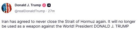 Αργότερα, τόνισε ότι το Ιράν δεσμεύτηκε πως δεν θα ξανακλείσει ποτέ τα Στενά, ως «όπλο εναντίον του κόσμου» και μίλησε για μια «σπουδαία και λαμπερή ημέρα».