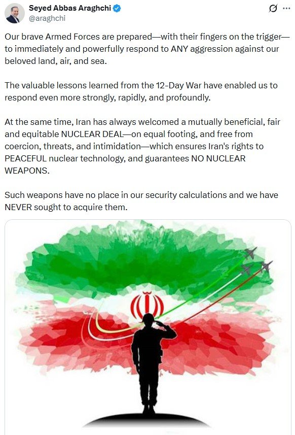 Ο υπουργός Εξωτερικών του Ιράν, Αμπάς Αραγτσί, προειδοποίησε ότι ο στρατός της χώρας του είναι «με το δάχτυλο στη σκανδάλη» για να απαντήσει σε κάθε αμερικανική επίθεση.