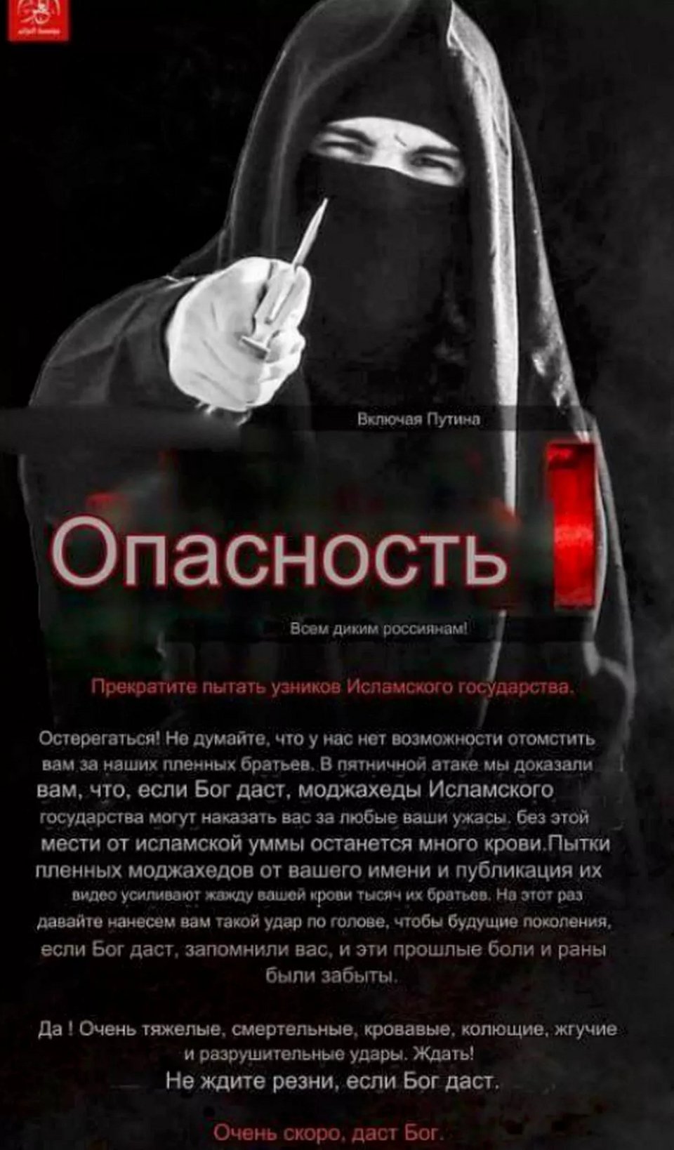 Το Ισλαμικό Κράτος ανέφερε: «Προς όλους τους άγριους Ρώσους! Σταματήστε να βασανίζετε κρατούμενους του Ισλαμικού Κράτους».