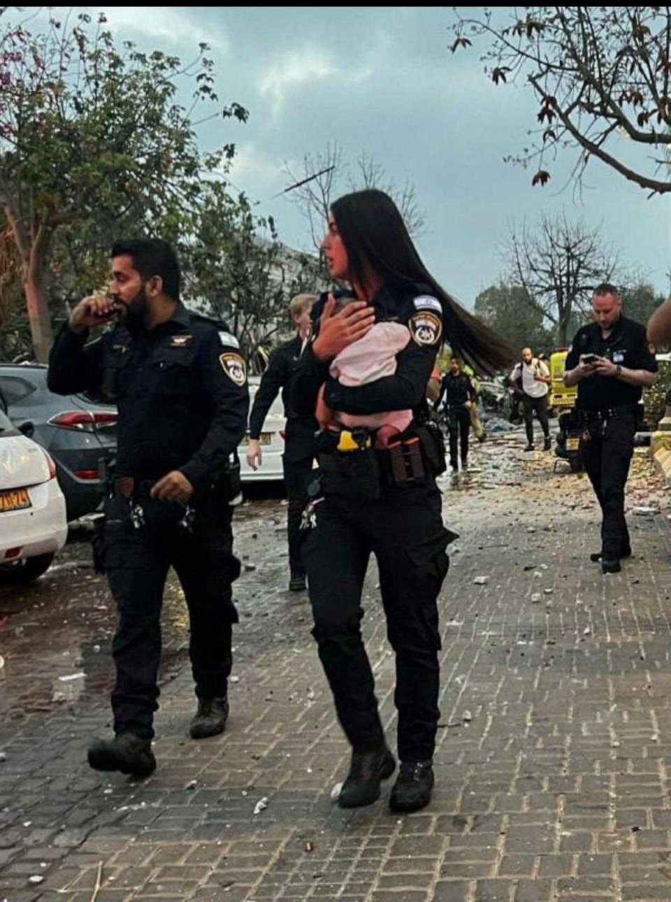 Σε φωτογραφία που δημοσίευσε η ισραηλινή αστυνομία διακρίνεται η αστυνομικός Αβίβ Σάργκα να κρατά στην αγκαλιά της το μωρό, που ανασύρθηκε από τα ερείπια του σπιτιού, που ισοπέδωσε ο ιρανικός πύραυλος στο Ρισόν Λεζιόν νότια του Τελ Αβίβ.