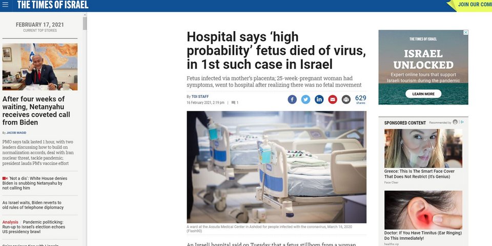 Σύμφωνα με δημοσιεύματα των «Times» του Ισραήλ, αλλά και της Jerusalem Post το έμβρυο κόλλησε κορωνοϊό μέσω του πλακούντα από την 29χρονη μητέρα του που βρισκόταν στην 25η εβδομάδα της κύησης και είχε βρεθεί θετική. Το μωρό πέθανε μέσα στην κοιλιά της...