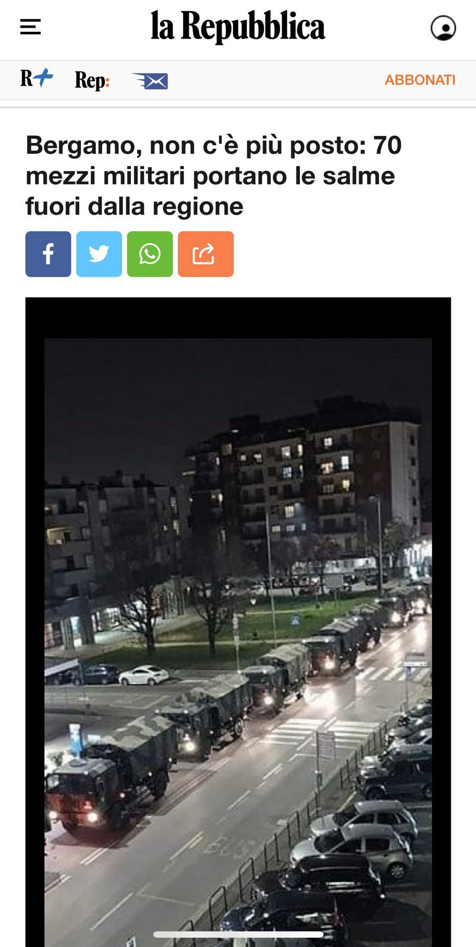 Η ιταλική εφημερίδα ανήρτησε μία φωτογραφία με στρατιωτικά οχήματα στην πόλη του Μπέργκαμο, τα οποία έχουν μέσα θύματα του κορωνοϊού. Οπως αναφέρει στη δημοσίευσή της η εφημερίδα, υπάρχει σοβαρό πρόβλημα στο νεκροταφείο της πόλης και με τόσους μαζεμένους θανάτους δεν μπορούσε το νεκροταφείο να διαχειριστεί τον αριθμό τους.