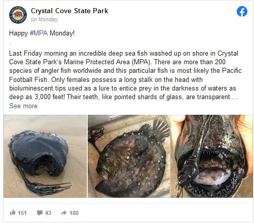 Σύμφωνα με το sfgate, υπάρχουν πάνω από 200 είδη τέτοιων ψαριών (anglerfish) σε όλο τον κόσμο. Αυτό που ξεβράστηκε στο Crystal Cove ήταν πιθανότατα ένα ψάρι του Ειρηνικού (Pacific football fish), και συνήθως, αυτό το είδος θα ζούσε σε νερά που δεν βλέπουν ποτέ το φως της ημέρας, μεταξύ 2.200 και 3.300 ποδιών, σύμφωνα με την Ακαδημία Επιστημών στην Καλιφόρνια.