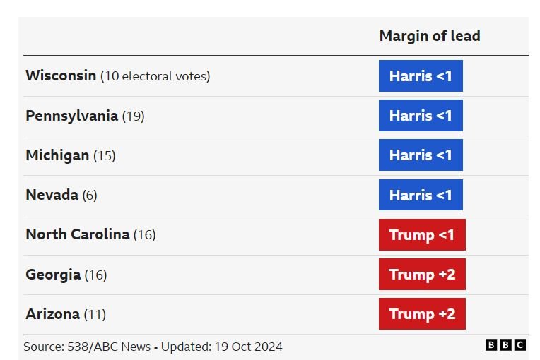 Αυτή τη στιγμή οι δημοσκοπήσεις είναι πολύ στενές στις επτά πολιτείες που θεωρούνται πεδία μάχης σε αυτές τις εκλογές και κανένας από τους υποψηφίους δεν έχει αποφασιστικό προβάδισμα σε καμία από αυτές, σύμφωνα με τους μέσους όρους των δημοσκοπήσεων.