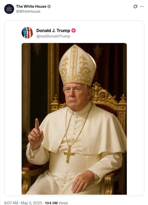 Η AI εικόνα του Τραμπ ως πάπας, δημοσιεύτηκε όχι μόνο στους προσωπικούς λογαριασμούς του Ντόναλντ Τραμπ, αλλά και σε αυτούς του Λευκού Οίκου, την Παρασκευή 2 Μαΐου, προκαλώντας σάλο.