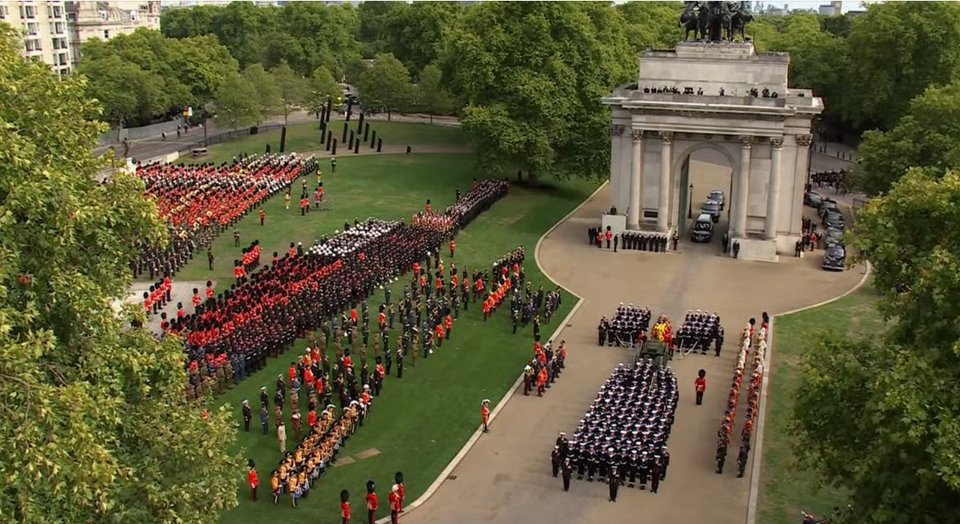 Καθώς το όχημα έφυγε από την αψίδα του Ουέλινγκτον, τα μέλη της στρατιωτικής παρέλασης χαιρέτισαν βασιλικά και ακούστηκε ξανά ο εθνικός ύμνος.