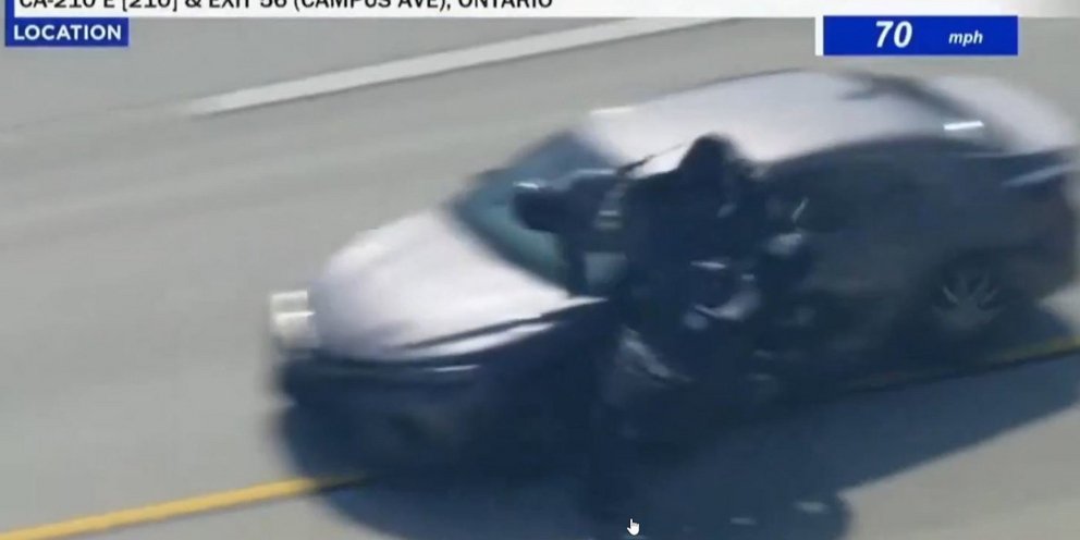 Σε κάποιο σημείο, ο ύποπτος παραλίγο να συγκρουστεί με αστυνομικό της τροχαίας αυτοκινητοδρόμων της Καλιφόρνια, που τον καταδίωκε με μοτοσικλέτα, όπως φαίνεται από τα πλάνα που κατέγραψαν ελικόπτερα τηλεοπτικών δικτύων.