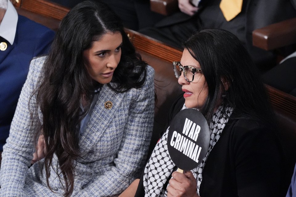 Την ίδια ώρα, η Ρασίντα Τλάιμπ κρατούσε έναν λευκό πίνακα που είχε φέρει μαζί της, γράφοντας προσωπικά σημειώματα διαμαρτυρίας προς τον Τραμπ.