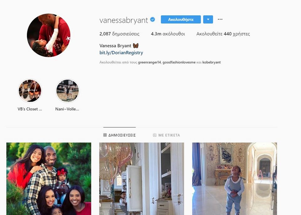 Στον προσωπικό της λογαριασμό στο Instagram, η σύζυγος του Κόμπι Μπράιαντ ανέβασε μία οικογενειακή φωτογραφία, όπου μαζί με τις τέσσερις κόρες τους, ποζάρουν χαμογελαστοί. Μάλιστα, η Τζιάνα, που σκοτώθηκε μαζί του, φαίνεται πάνω από τον Κόμπι Μπράιαντ να τον αγκαλιάζει, δείγμα της αγάπης που του είχε. Στην κεντρική φωτογραφία της μάλιστα που έχει ως προφίλ, έβαλε τον σύζυγο και την κόρη της από ένα All Star Game που την κρατάει αγκαλιά, με τα μηνύματα να πέφτουν «βροχή» από τον κόσμο. Μέσα σε μία ώρα από την στιγμή που έκανε το ποστάρισμα, πήρε πάνω από 3 εκ. like, με τα συλλυπητήρια από τον κόσμο να είναι αμέτρητα.