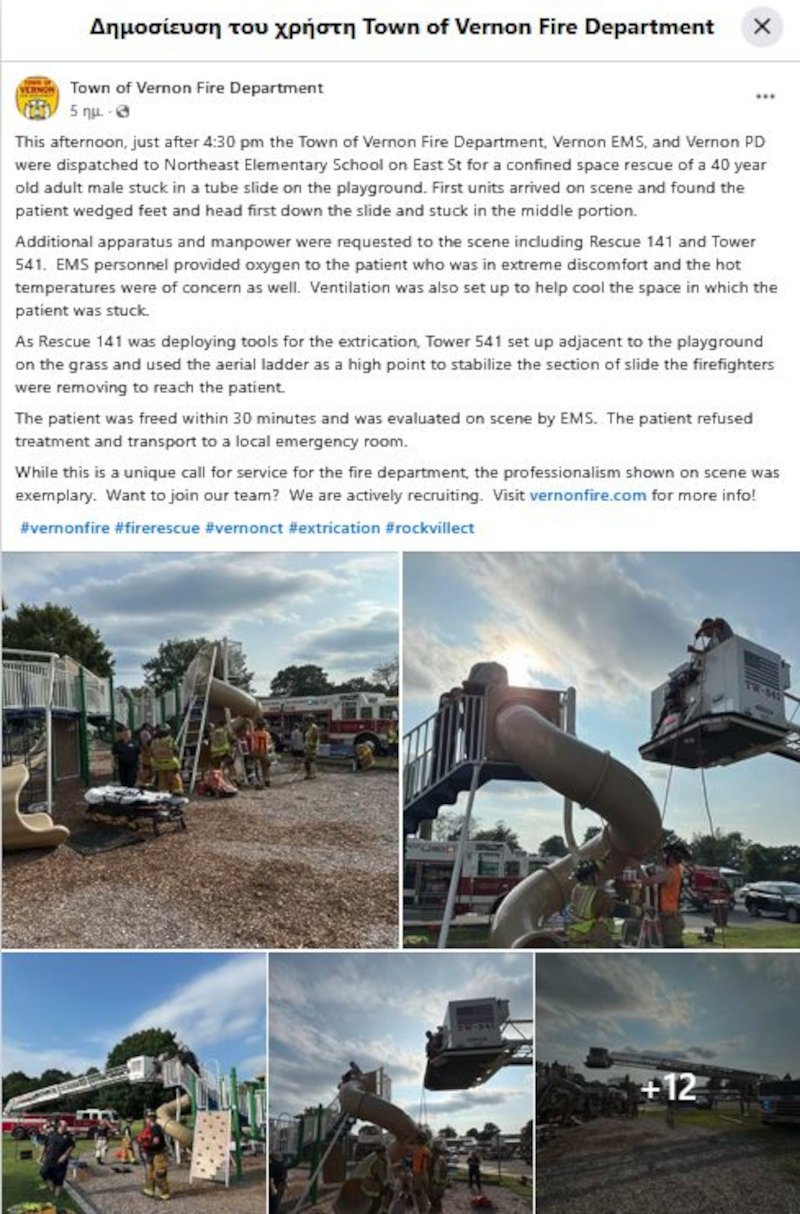Οι διασώστες βρήκαν τον 40χρονο, τα στοιχεία του οποίου για ευνόητους λόγους δεν έχουν δοθεί στη δημοσιότητα, «σφηνωμένο με το κεφάλι και τα πόδια» στο μεσαίο τμήμα της σχεδιασμένης για παιδιά κι όχι μεγαλώσομους άνδρες τσουλήθρας στην παιδική χαρά δημοτικού σχολείου λίγο μετά τις 16:30 τοπική ώρα το απόγευμα του περασμένου Σαββάτου, όπως αναφέρει η Πυροσβεστική Υπηρεσία του Βέρνον.