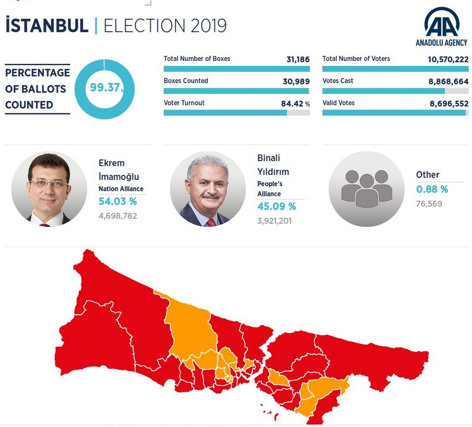 Σύμφωνα με τα αποτελέσματα μετά τη καταμέτρηση του 99% των ψήφων, ο Εκρέμ Ιμάμογλου εξασφαλίζει το 54,03% των ψήφων, έναντι 45,09% για τον υποψήφιο του Ερντογάν, τον πρώην πρωθυπουργό Μπιναλί Γιλντιρίμ.