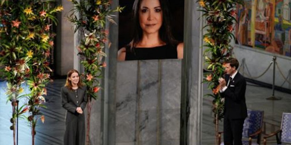 Η ηγέτιδα της βενεζουελάνικης αντιπολίτευσης, αν και «ασφαλής» και καθ’ οδόν προς τη Νορβηγία σύμφωνα με το Ινστιτούτο Νόμπελ, δεν κατάφερε να παραστεί στη σημερινή απονομή, που ολοκληρώθηκε πριν από λίγη ώρα.