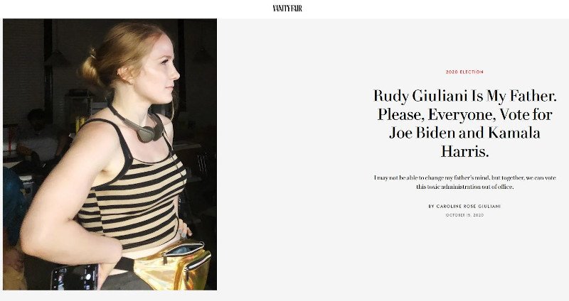 Ο πατέρας της Κάρολαϊν Ρόουζ Τζουλιάνι, πρώην δήμαρχος της Νέας Υόρκης και προσωπικός δικηγόρος του Τραμπ υπήρξε ένας από τους πιο ένθερμους οπαδούς του στη διάρκεια της έρευνας για την εμπλοκή της Ρωσίας στις προεδρικές εκλογές του 2020, την παραπομπή του Τραμπ στο Κογκρέσο με το ερωτηματικό της καθαίρεσης ή την πανδημία του κορωνοϊού. Και λίγες εβδομάδες πριν την αναμέτρηση της 3ης Νοεμβρίου ο Ρούντι Τζουλιάνι επανήλθε στο προσκήνιο εν μέσω δημοσιεύματος της New York Post ότι βρήκε ενοχοποιητικά στοιχεία σε κατεστραμμένο λάπτοπ του Χάντερ Μπάιντεν εις βάρος του πατέρα του Τζο, με το Τwitter και το Facebook να βάζουν φραγμούς στη διάδοση του σχετικού ρεπορτάζ αμφισβητώντας την εγκυρότητά του. Αλλά η κόρη του Τζουλιάνι παίρνει σαφείς αποστάσεις από τον πατέρα της σε κείμενό της στο Vanity Fair: «Ο πατέρας μου είναι ο Ρούντι Τζουλιάνι. Απέχουμε ολόκληρα σύμπαντα πολιτικά και σε άλλους τομείς. Πέρασα τη ζωή μου προσπαθώντας να οικοδομήσω τη δική μου ταυτότητα, μακριά από το επώνυμό μου και μπορεί να ακούγεται παράλογο τώρα να παρουσιάζομαι δημοσίως ως μία “Τζουλιάνι” , αλλά συνειδητοποίησα ότι κανείς δεν μπορεί να μείνει σιωπηλός τώρα», γράφει η συγγραφέας, ηθοποιός και σκηνοθέτιδα, που είχε στηρίξει προ τετραετίας την υποψηφιότητα της Χίλαρι Κλίντον και ψήφισε Ομπάμα προ οκταετίας.