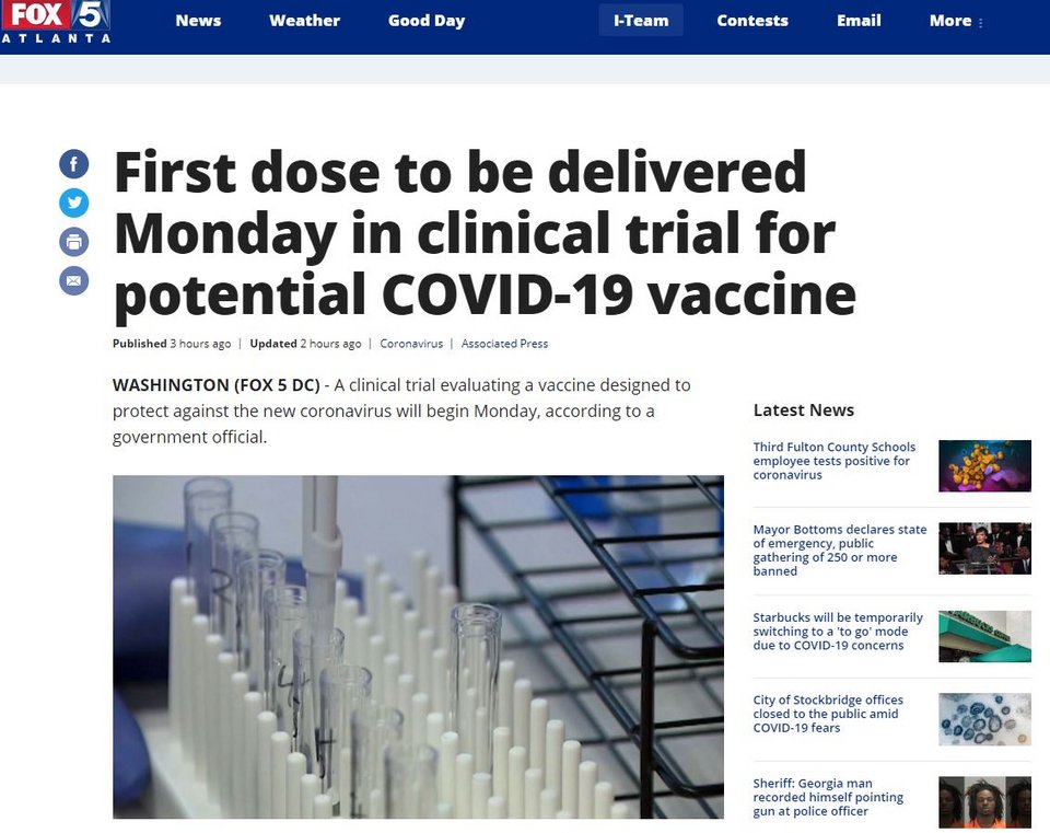 Την είδηση αποκάλυψε αξιωματούχος (δεν κατονομάστηκε), με το Fox να αναφέρει πως οι δοκιμές θα γίνουν 45 ασθενείς οι οποίοι παρουσιάζουν ήπια συμπτώματα. Την είδηση επιβεβαίωσε και το Associated Press. Εδώ και δέκα περίπου ημέρες είχε διαρρεύσει πως οι ΗΠΑ ετοιμάζονται να κάνουν δοκιμαστικά εμβόλια και αυτό θα γίνει σε εθελοντές ασθενείς, στο Kaiser Permanente Washington Health Research Institute, στο Σιάτλ.