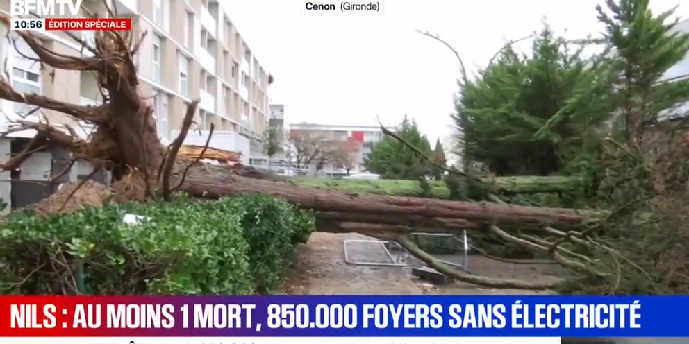 Το δυστύχημα κοντά στην Νταξ, στο διαμέρισμα Λαντ, «συνδέεται με πτώση κορμού δέντρου» σύμφωνα με εκπρόσωπο της νομαρχίας. Στο διαμέρισμα αυτό, οι ριπές ανέμου στη διάρκεια της νύχτας έφθασαν τα 162 χλμ/ώρα στην Μπισκαρός στην ακτή.