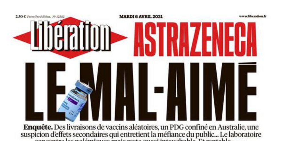 Με τίτλο «AstraZeneca το λιγότερο αγαπητό εμβόλιο» κυκλοφορεί στο φύλλο της Τρίτης, 6 Απριλίου, το πρωτοσέλιδο της γαλλικής εφημερίδας Liberation.