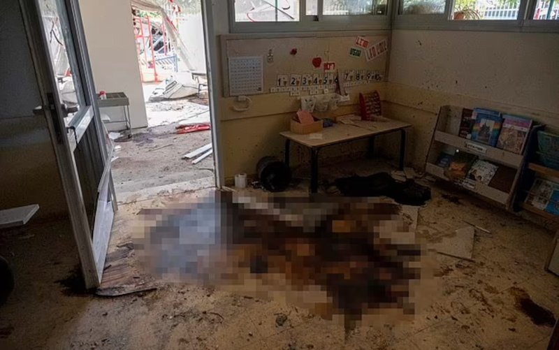 Ολόκληρο το νηπιαγωγείο, όπου φοιτούσαν παιδιά ηλικίας κάτω των πέντε ετών, μετατράπηκε σε σκηνικό τρόμου με χνάρια από αίματα στο έδαφος και άδειους γεμιστήρες από Καλάσνικοφ που άφησαν πίσω τους οι ένοπλοι της Χαμάς ανάμεσα σε παιδικά καθίσματα, τραπέζια και παιχνίδια, μετά το μακελειό το πρωινό της 7ης Οκτωβρίου 2023 στο κιμπούτς Be’eri σε απόσταση λίγων χιλιομέτρων από τη Γάζα.