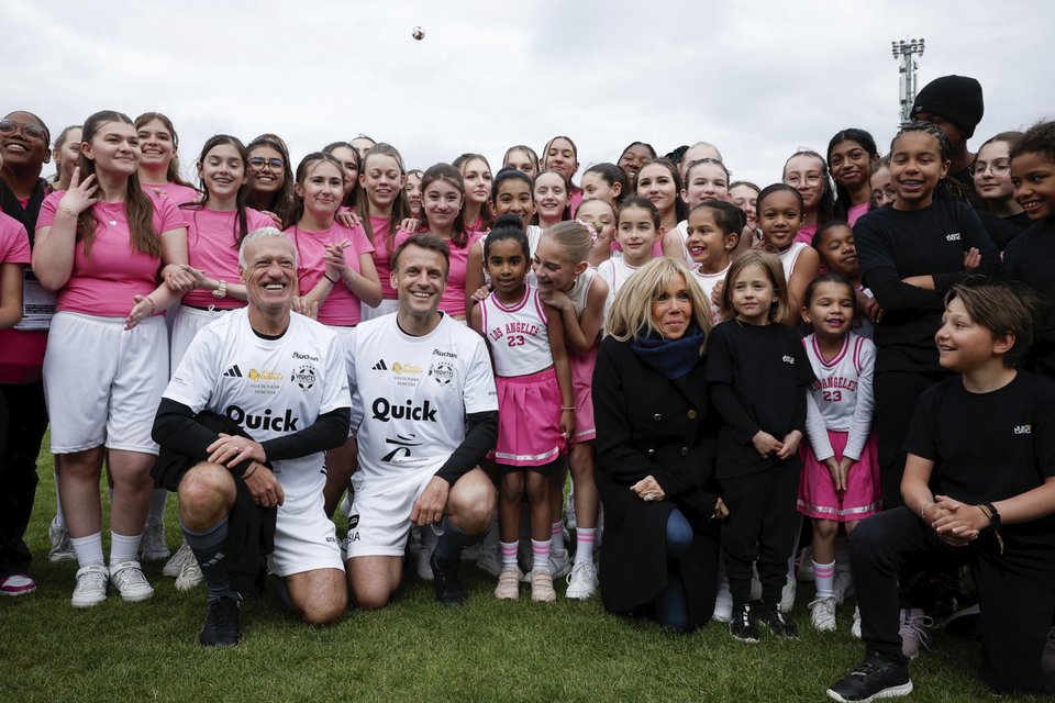 Στο πλευρό του είχε παλιές δόξες του γαλλικού ποδοσφαίρου, όπως ο Ντιντιέ Ντεσάμπ, ο Λοράν Μπλαν, ο Μαρσέλ Ντεσαγί, ο Ρομπέρ Πιρές, ο Κριστιάν Καρεμπέ, ο Αρσέν Βενγκέρ κ.ά., αλλά και την… Μπριζίτ Μακρόν, η οποία τον συνόδεψε κατά την είσοδο των δύο ομάδων.