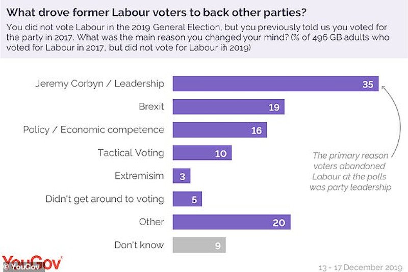 Αυτό τουλάχιστον πιστεύουν πρώην ψηφοφόροι των Εργατικών, σύμφωνα με δημοσκόπηση που έκανε το YouGov. Ρωτώντας 500 άτομα τα οποία τον είχαν στηρίξει στις εκλογές του 2017, πιστεύοντας πως μπορεί να ηγηθεί της Μεγάλης Βρετανίας, τώρα οι περισσότεροι θεωρούν πως η αιτία της συντριβής στις εκλογές του Δεκέμβρη, ήταν τα λάθη στην ηγεσία του. Γι’ αυτό και αποφάσισαν να στραφούν σε άλλα κόμματα.