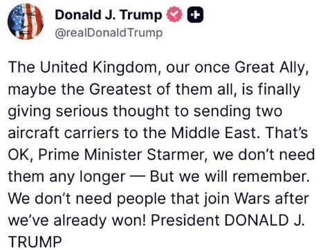 Ο Ντόναλντ Τραμπ «δίκασε» χθες Σάββατο τον Κιρ Στάρμερ σχετικά με την στάση του Ηνωμένου Βασιλείου στον πόλεμο της Μέσης Ανατολής και ο Βρετανός πρωθυπουργός έκανε «κίνηση».