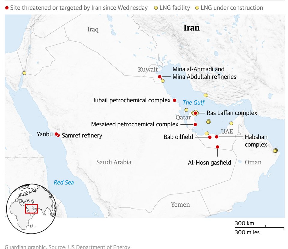 Οι ιρανικές επιθέσεις έχουν ήδη πλήξει το εργοστάσιο υγροποιημένου φυσικού αερίου Ras Laffan του Κατάρ -υπεύθυνο για περίπου το 20% της παγκόσμιας παραγωγής LNG- αλλά και διυλιστήρια στη Σαουδική Αραβία και το Κουβέιτ, προκαλώντας σοβαρές ζημιές και απειλώντας τις παγκόσμιες προμήθειες για χρόνια.