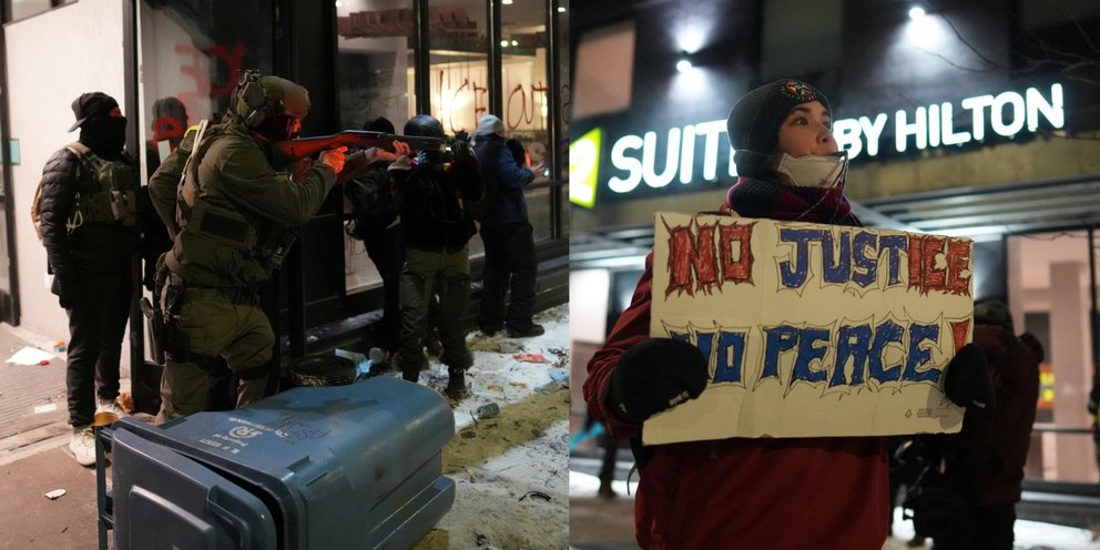 Βίντεο που κυκλοφόρησαν στα κοινωνικά δίκτυα δείχνουν διαδηλωτές να σπάνε παράθυρα, να γράφουν με κόκκινο σπρέι συνθήματα όπως «ICE OUT OF MPLS» («Έξω η ICE από τη Μινεάπολη») και «No justice, no peace» («Καμία ειρήνη χωρίς δικαιοσύνη»), ενώ άλλοι χτυπούσαν σκουπιδοτενεκέδες.