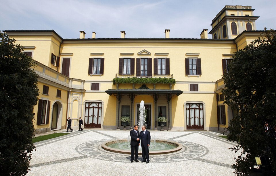 Ο Ιταλός πρωθυπουργός Σίλβιο Μπερλουσκόνι και ο Ρώσος πρωθυπουργός Βλαντίμιρ Πούτιν συνομιλούν κατά τη διάρκεια συνέντευξης Τύπου στη Villa Gernetto, στο Gerno, κοντά στο Μιλάνο, τον Απρίλιο του 2010. Ο πρωθυπουργός Σίλβιο Μπερλουσκόνι φιλοξένησε τον Ρώσο πρωθυπουργό Βλαντίμιρ Πούτιν στη βίλα του, καθώς οι δύο χώρες επιδίωκαν τότε να ενισχύσουν τους επιχειρηματικούς δεσμούς τους στον τομέα της ενέργειας.
