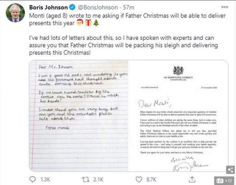 Τις ανησυχίες των παιδιών για την έλευση του Αϊ-Βασίλη την περίοδο των γιορτών επιχείρησε να κατευνάσει ο Μπόρις Τζόνσον, διαβεβαιώνοντας με επιστολή του ότι ο αγαπημένος άγιος των παιδιών θα παραδώσει κανονικά τα δώρα του και φέτος, παρά τα περιοριστικά μέτρα για την αναχαίτιση της πανδημίας του κορωνοϊού.