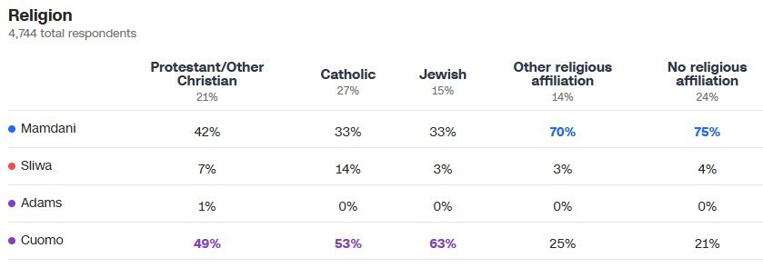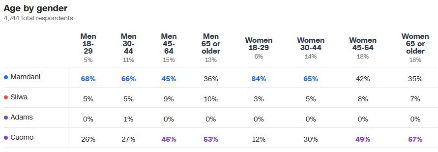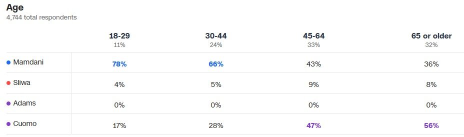 Στους πολύ νέους (18-29) φαίνεται να τον ψήφισε το 78%, ενώ στην παραγωγική ηλικιακή ομάδα 30-44, το ποσοστό του μετρήθηκε στο 66%. Καθώς οι ηλικιακές κατηγορίες ανεβαίνουν, ο Μαμντάνι χάνει από τον 67χρονο, επίσης Δημοκρατικό, Άντριου Κουόμο, που ήταν κυβερνήτης της πολιτείας της Νέας Υόρκης και θεωρείται τέκνο του κομματικού κατεστημένου.