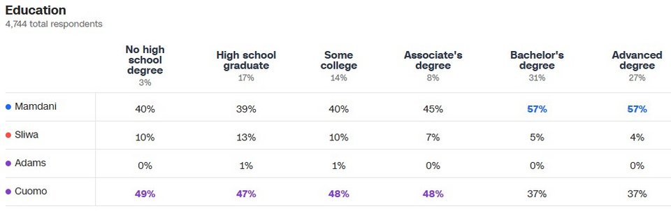 Στο επίπεδο εκπαίδευσης, είναι σαφής η επικράτηση του Μαμντάνι στους Νεοϋορκέζους με πτυχίο (απλό ή μεγαλύτερο επίπεδο, όπως μεταπτυχιακό, διδακτορικό κ.λπ.) με ποσοστό 57%.