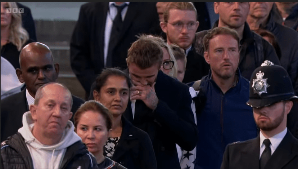 Ο Μπέκαμ εμφανίστηκε συγκινημένος καθώς περίμενε τη σειρά του να αποτίσει τα σέβη του στη βασίλισσα. Σε φωτογραφίες καταγράφηκε να σκουπίζει την άκρη του ματιού του και να καλύπτει το στόμα του με το χέρι του, καθώς πλησίαζε στο μπροστινό μέρος της πομπής.