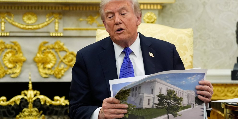 Το σχέδιο του Τραμπ για το πολλών εκατομμυρίων δολαρίων έργο περιλαμβάνει μια τεράστια αίθουσα χορού και περίτεχνες χρυσές λεπτομέρειες. Η αίθουσα χορού θα περιλαμβάνει επίσης χρυσούς πολυελαίους, μια περίτεχνη οροφή με καμάρες, ελληνικές κορινθιακές κολώνες και ψηλά τοξωτά παράθυρα σε κάθε τοίχο, εκτός από χώρο για αρκετά στρογγυλά τραπέζια και χρυσές καρέκλες.