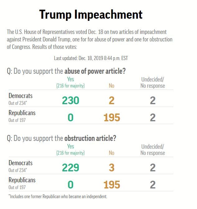 Οπως αναμενόταν, η Βουλή, στην οποία την πλειοψηφία έχει το κόμμα των Δημοκρατικών, ανήγγειλε την έγκριση της απαγγελίας κατηγοριών στον Τραμπ για το τηλεφώνημα στον Ουκρανό πρόεδρο Ζελένσκι, τον οποίο φέρεται να πίεσε για να γίνει έρευνα σε βάρος του Τζο Μπάιντεν και του γιου του. Στο άρθρο 1 (κατάχρηση εξουσίας) όλα τα μέλη των Ρεπουμπλικανών ψήφισαν κατά, ενώ από πλευράς Δημοκρατικών 230 ήταν τα «ναι», δύο είπαν «όχι», ενώ μία βουλευτής ψήφισε «παρών». «Ναι» ψήφισε και ένας ανεξάρτητος βουλευτής.