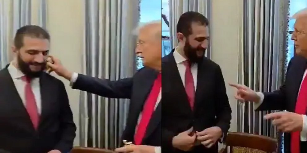 Ο Αμερικανός πρόεδρος χάρισε στον 43χρονο Αλ Σαρά ένα μπουκάλι άρωμα, με το οποίο μάλιστα τον ψέκασε, αναφέροντας ότι είναι «το καλύτερο». «Και το άλλο είναι για τη σύζυγό σου», είπε ο Τραμπ, πριν ρωτήσει: «Πόσες είναι οι σύζυγοι; Μία;». «Μία» απάντησε ο Σύρος πρόεδρος, με τον Τραμπ να σχολιάζει: «Με εσάς, ποτέ δεν ξέρω».