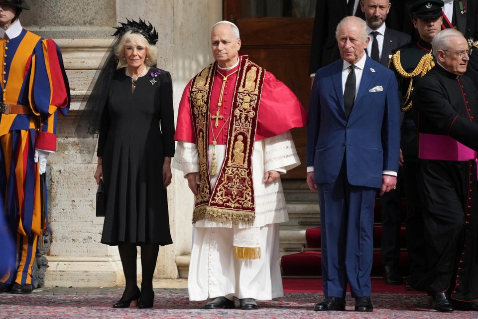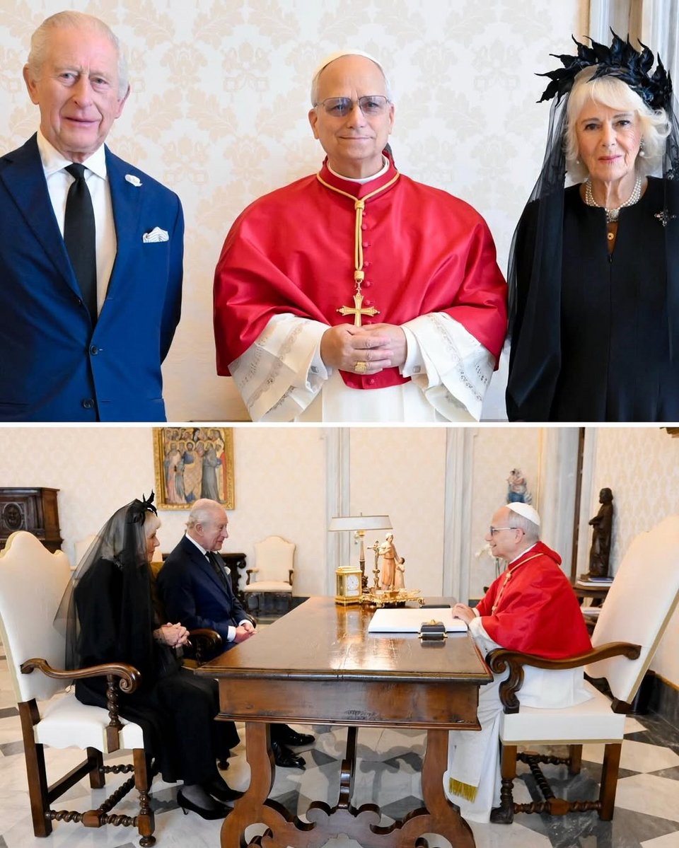 Ο Κάρολος συνοδευόμενος από τη σύζυγό του, Καμίλα, παρουσιάστηκε στον πάπα Λέοντα ΙΔ΄ στη βιβλιοθήκη του Αποστολικού Παλατιού, που αποτελεί το παραδοσιακό σημείο για τέτοιου είδους συναντήσεις.