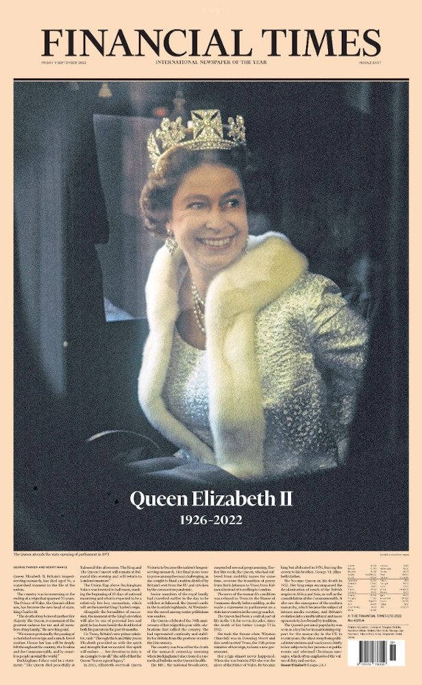 Η εφημερίδα Financial Times συνόψισε: «Η βασίλισσα Ελισάβετ Β', η μακροβιότερη μονάρχης της Βρετανίας, πέθανε προκαλώντας πένθος στον λαό της. Αντανακλώντας όμως μια ζωή καθήκοντος στην οποία ένωσε τη χώρα μέσα από 70 χρόνια βαρυσήμαντων αλλαγών».