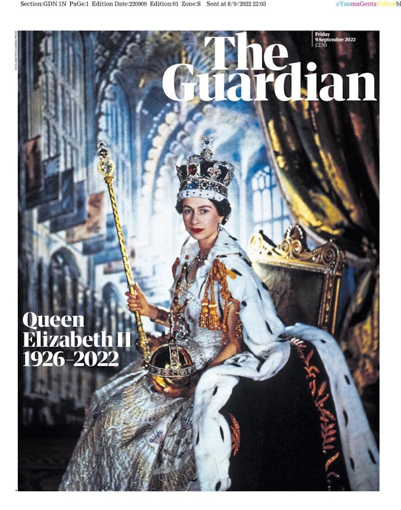 Η Guardian επέλεξε φωτογραφία της βασίλισσας καθώς κρατά τη βασιλική σφαίρα και το σκήπτρο της. Παρόμοια φωτογραφία επέλεξε η Independent.