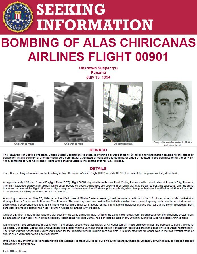 Το αεροσκάφος (πτήση Alas Chiricanas 901) εξερράγη αφού απογειώθηκε από ένα αεροδρόμιο της επαρχίας Κολόν, τη νύχτα της 19ης Ιουλίου 1994. Όλοι οι επιβάτες, στην πλειονότητά τους μέλη της εβραϊκής κοινότητας του Παναμά, σκοτώθηκαν. Μεταξύ αυτών ήταν και τρεις Αμερικανοί. Αυτή ήταν η χειρότερη επίθεση που έχει σημειωθεί στην ιστορία του Παναμά.