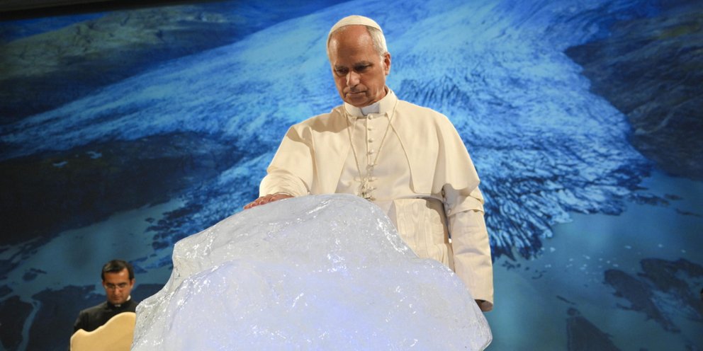 Ο πάπας Λέων στη σκηνή με ένα τεράστιο κομμάτι πάγου