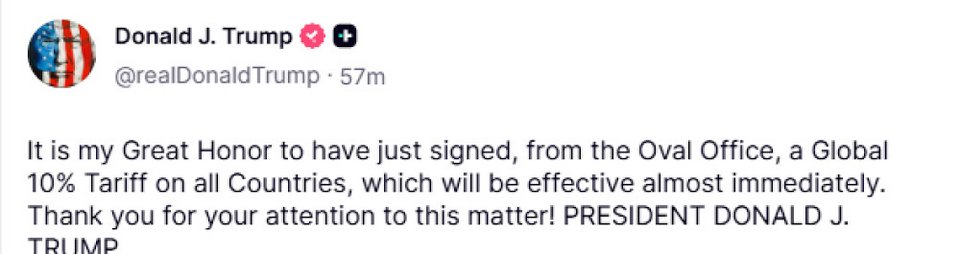 «Είναι μεγάλη μου τιμή που μόλις υπέγραψα στο Οβάλ Γραφείο έναν παγκόσμιο δασμό 10% σε όλες τις χώρες, που θα τεθεί σε ισχύ σχεδόν αμέσως», ανέφερε σε ανάρτησή του ο ένοικος του Λευκού Οίκου, προσθέτοντας ότι δεν χρειάζεται έγκριση από το Κογκρέσο για την εφαρμογή του μέτρου.