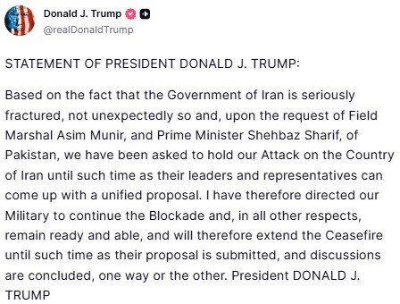 «Ως εκ τούτου, έδωσα εντολή στο στρατό μας να συνεχίσει τον αποκλεισμό και, από κάθε άλλη άποψη, να παραμείνει έτοιμος και σε ετοιμότητα, και θα παρατείνω την κατάπαυση του πυρός έως ότου υποβληθεί η πρότασή τους και ολοκληρωθούν οι συζητήσεις, με τον έναν ή τον άλλο τρόπο», σημείωσε ο Τραμπ.