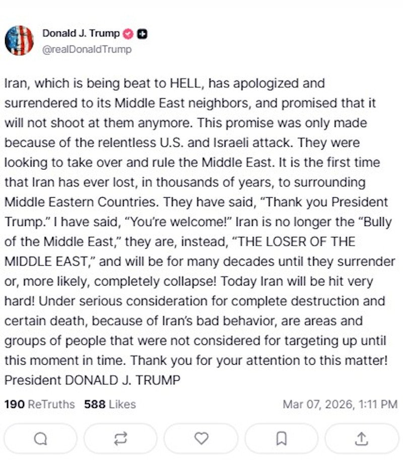 «Το Ιράν ζήτησε συγγνώμη από τους γείτονές του και παραδόθηκε σε αυτούς, υποσχόμενο ότι δεν θα ξαναεπιτεθεί εναντίον τους», έγραψε ο Αμερικανός πρόεδρος. «Αυτή η υπόσχεση έγινε μόνο εξαιτίας των αμείλικτων επιθέσεων των ΗΠΑ και του Ισραήλ».