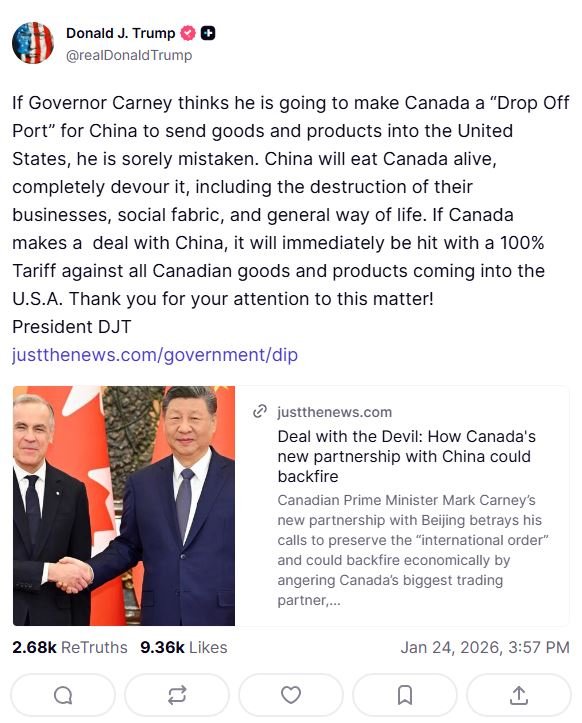 «Αν ο Κυβερνήτης Κάρνεϊ πιστεύει ότι θα κάνει τον Καναδά "Λιμάνι Αποθήκη" για να στέλνει η Κίνα αγαθά και προϊόντα στις Ηνωμένες Πολιτείες, κάνει μεγάλο λάθος», έγραψε ο Τραμπ στο Truth Social. «Η Κίνα θα φάει ζωντανό τον Καναδά, θα τον καταβροχθίσει εντελώς, περιλαμβανομένης της καταστροφής των επιχειρήσεών τους, του κοινωνικού ιστού τους και του γενικού τρόπου ζωής τους. Αν ο Καναδάς κάνει συμφωνία με την Κίνα, θα πληγεί αμέσως με επιβολή Δασμού 100% σε όλα τα καναδικά αγαθά και προϊόντα που έρχονται στις ΗΠΑ».