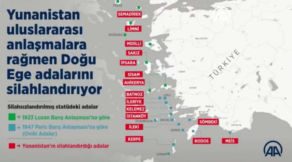 «Τα νησιά δόθηκαν στην Ελλάδα με τις συμφωνίες της Λωζάννης και του Παρισιού. Υπάρχει ο ίδιος όρος και στις δύο συμφωνίες. Η Ελλάδα δεν θα εξοπλίσει αυτά τα νησιά. Αλλά άρχισαν να στρατιωτικοποιούν και πρώτα το αρνήθηκαν και μετά το δέχτηκαν. Είπαν ότι υπάρχει απειλή από την Τουρκία. Εμείς, ως Τουρκία, κάναμε τις απαραίτητες προειδοποιήσεις. Στείλαμε δύο επιστολές στον ΟΗΕ, εξηγώντας ότι η Ελλάδα εξόπλιζε αυτά τα νησιά.
