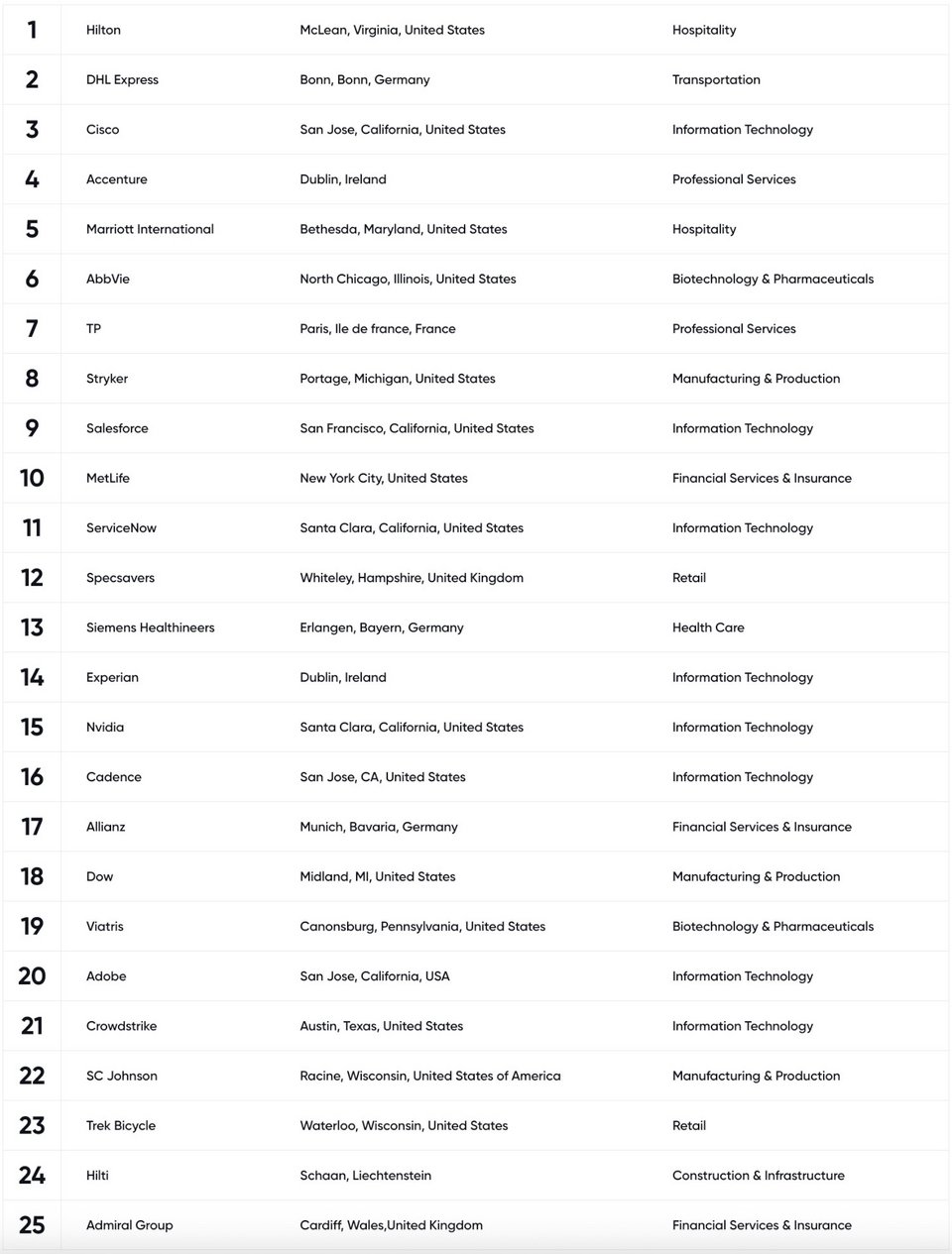 Hilton, DHL Express, Cisco, Accenture, Marriott International, AbbVie, TP, Stryker, Salesforce, MetLife, ServiceNow, Specsavers, Siemens Healthineers, Experian, Nvidia, Cadence, Allianz, Dow, Viatris, Adobe, Crowdstrike, SC Johnson, Trek Bicycle, Hilti, Admiral Group