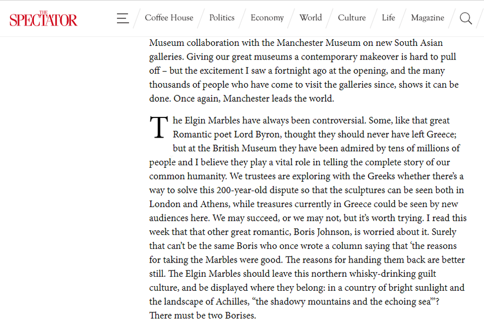 «Διάβασα αυτή την εβδομάδα ότι ένας άλλος ρομαντικός, ο Μπόρις Τζόνσον, ανησυχεί για αυτό», γράφει ο Όσμπορν. «Σίγουρα δεν μπορεί να είναι ο ίδιος Μπόρις που κάποτε είχε γράψει σε μια στήλη ότι “οι λόγοι που αποσπάστηκαν ήταν σωστοί. Οι λόγοι επιστροφής τους όμως είναι ακόμα καλύτεροι. Τα Ελγίνεια Μάρμαρα θα έπρεπε να εγκαταλείψουν αυτή την ενοχική κουλτούρα του αλκοολικού βορρά και να εκτεθούν εκεί όπου ανήκουν: στη χώρα του λαμπερού φωτός, στη γη του Αχιλλέα, “στα σκιερά βουνά και στη θάλασσα που αντηχεί”». Πρέπει να υπάρχουν δύο διαφορετικοί Μπόρις», καταλήγει ο διευθυντής του Βρετανικού Μουσείου.